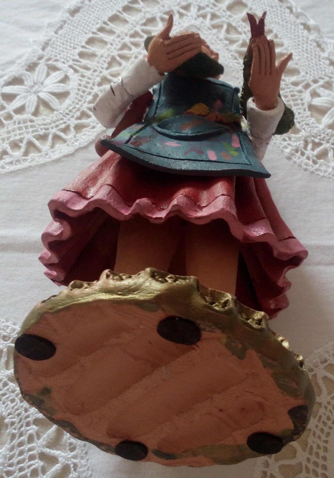 Explicações da Milena Miguel quando lhe comprei a peça: "Nas Caldas da Rainha, os homens tradicionalmente fazem o enchimento das peças, nos moldes, sendo depois as mulheres que os pintam". "As mulheres das Caldas usam sapatinhos e não chinelos, muito menos andam descalças".