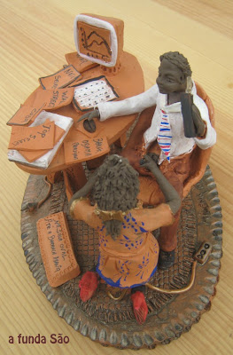 A Milena Miguel, do Atelier S. Miguel, é uma artista que é funda fornecedora da minha colecção de arte erótica. Este ano esteve de novo com o marido, Fernando Miguel, na feira de artesanato de Coimbra. E trouxe-me desta vez esta cena «na Sala Oval até a Barraca Abana», a juntar às outras.